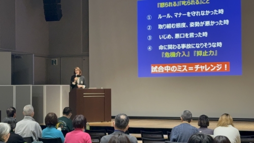 今年度も講師には元女子バレーボール日本代表のエースアタッカーだった益子直美氏をお招きして、「過去の体験やエピソード」「怒りとの向き合い方」「メンタルの整え方」などについてお話をしていただき、参加者も自身の過去の怒り方について振り返ることのできる時間となりました。